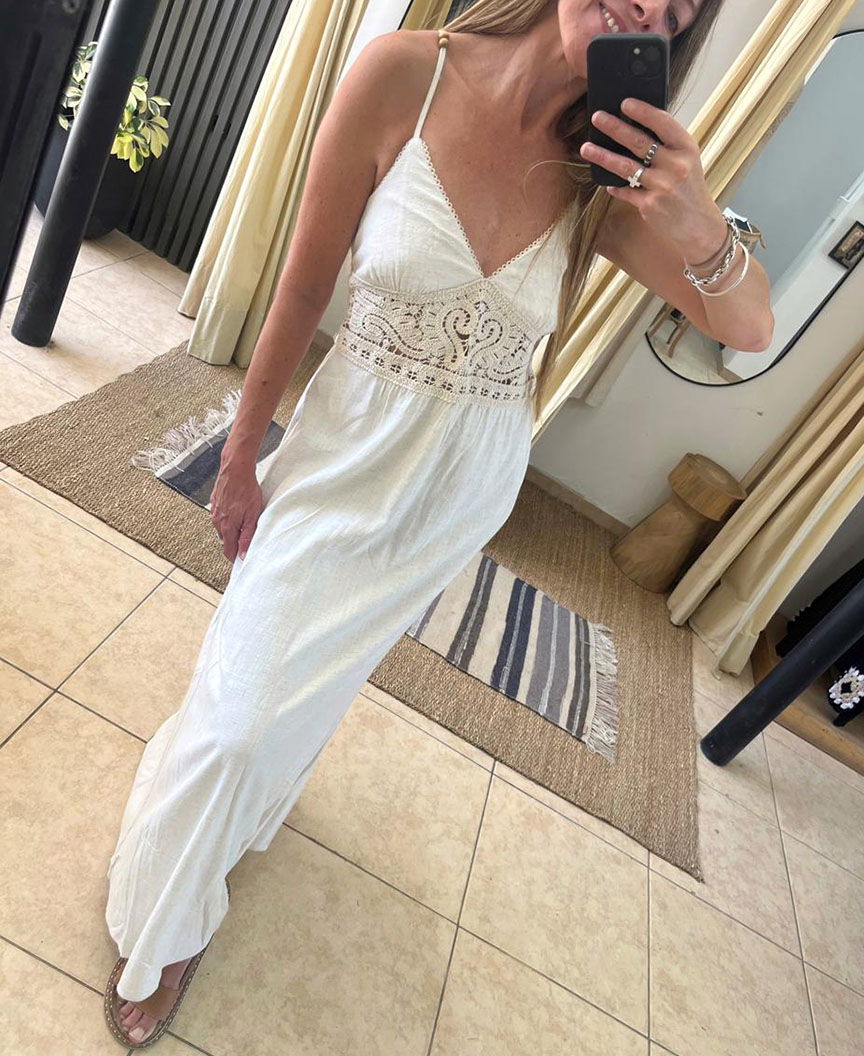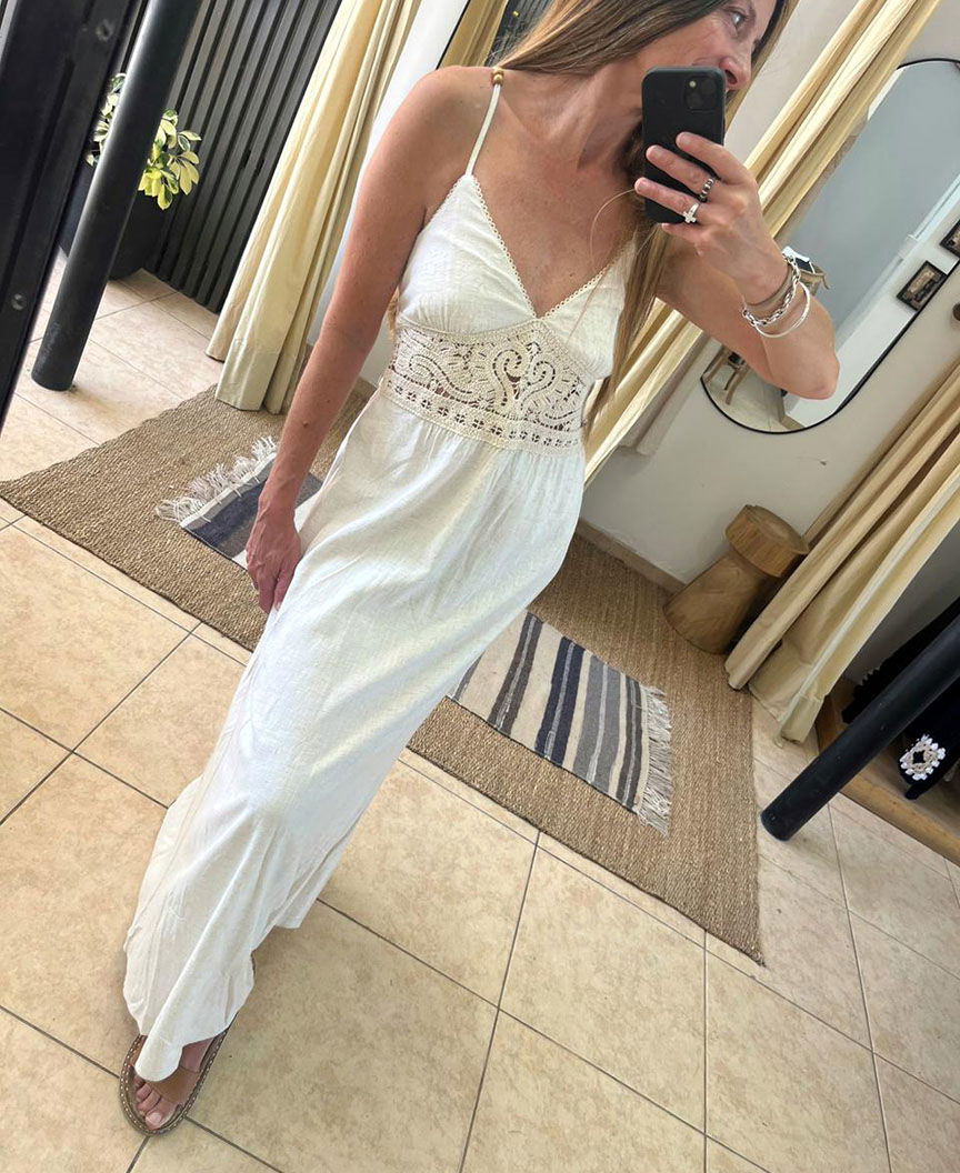 Un vestido increíble, en color off white crudo, con bretel ajustable y cuentitas de madera. Detalle en el canesú tejido en crochet y espalda elastizada. Lo bueno, no transparenta. Lo mejor: te va a quedar hermoso.