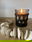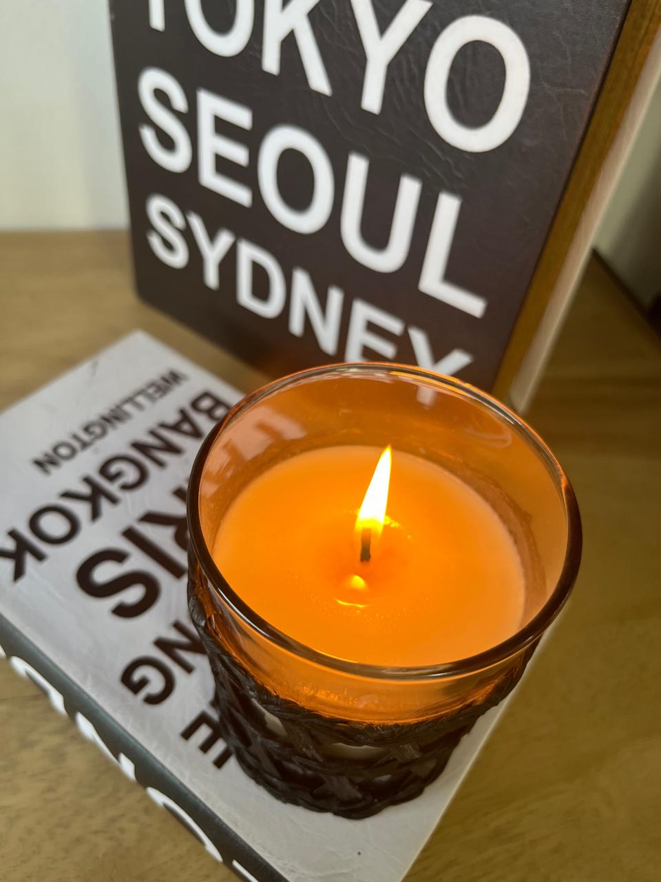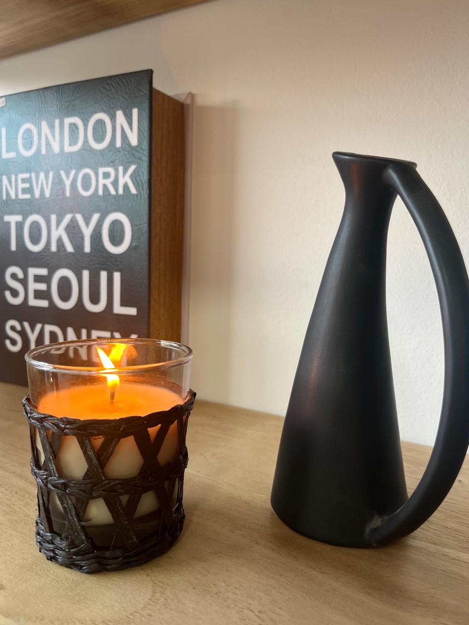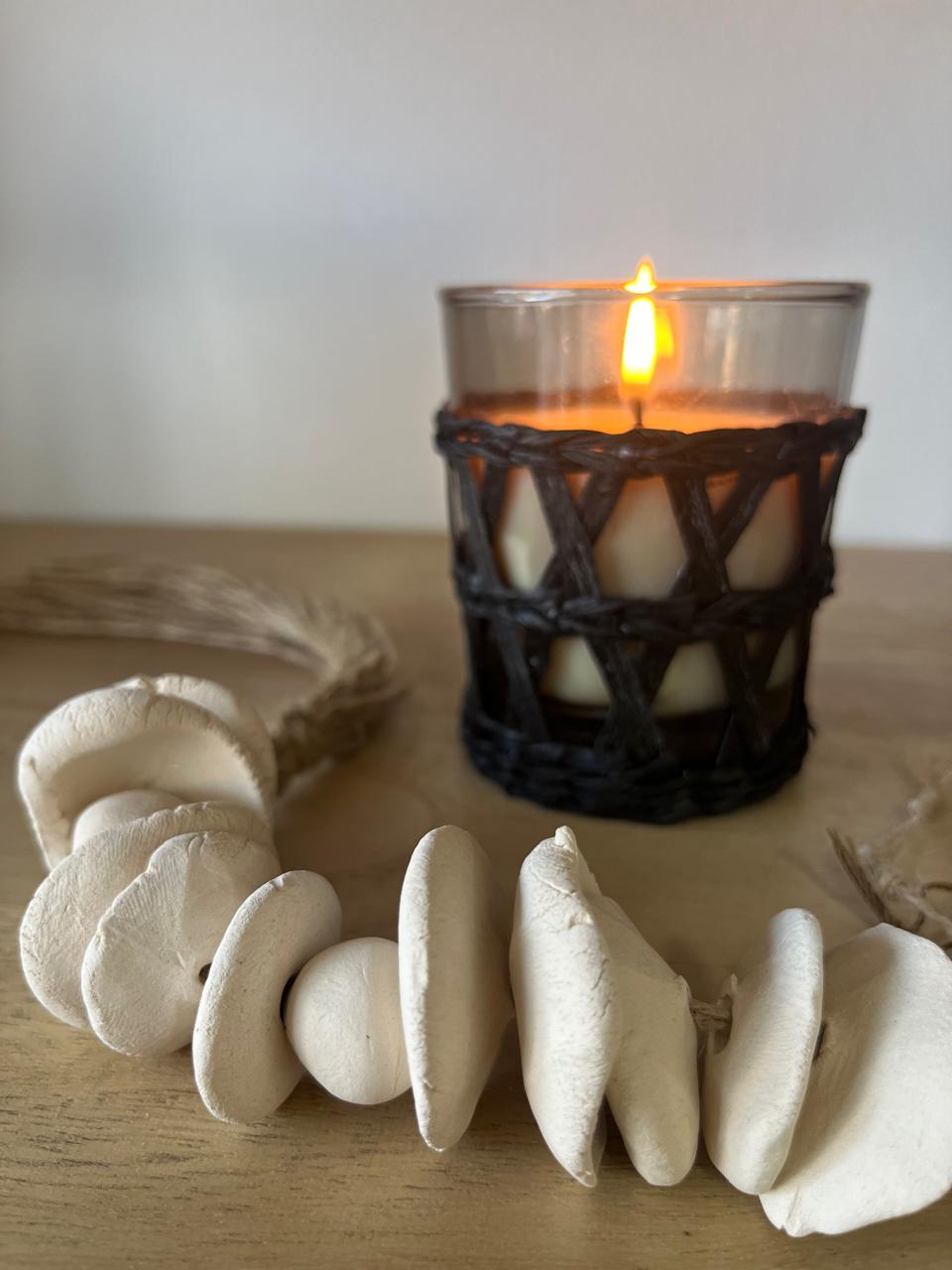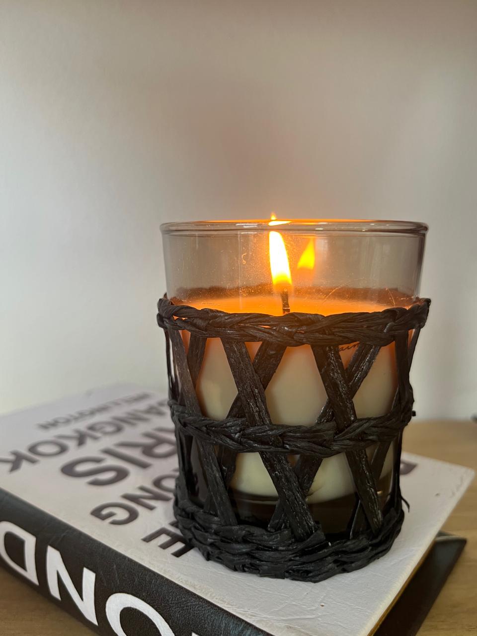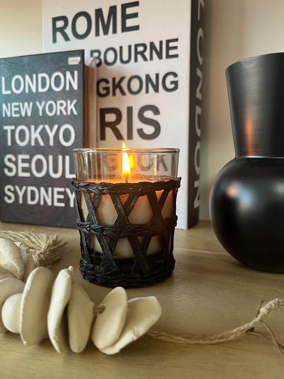 Delicada vela que luce por su "canastita" de ratán negro, lo que genera un hermoso efecto de contraste entre la luminosidad y las fibras naturales.