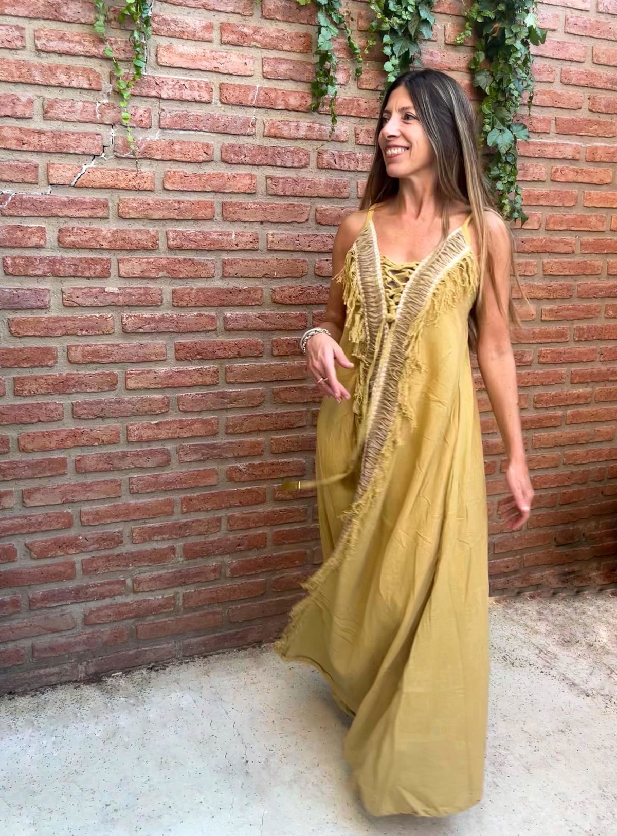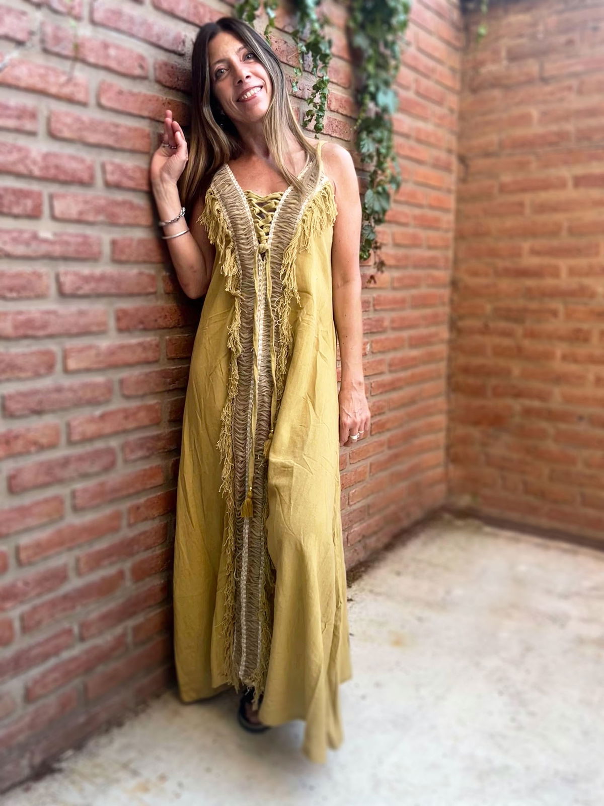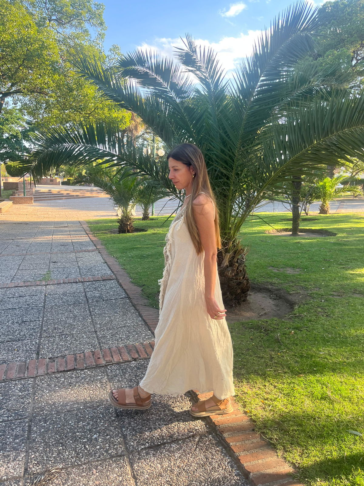 Vestido artesanal, de diseño. Lino y algodón, con guarda vertical en yute y fleos, breteles regulables y elastizado en espalda.