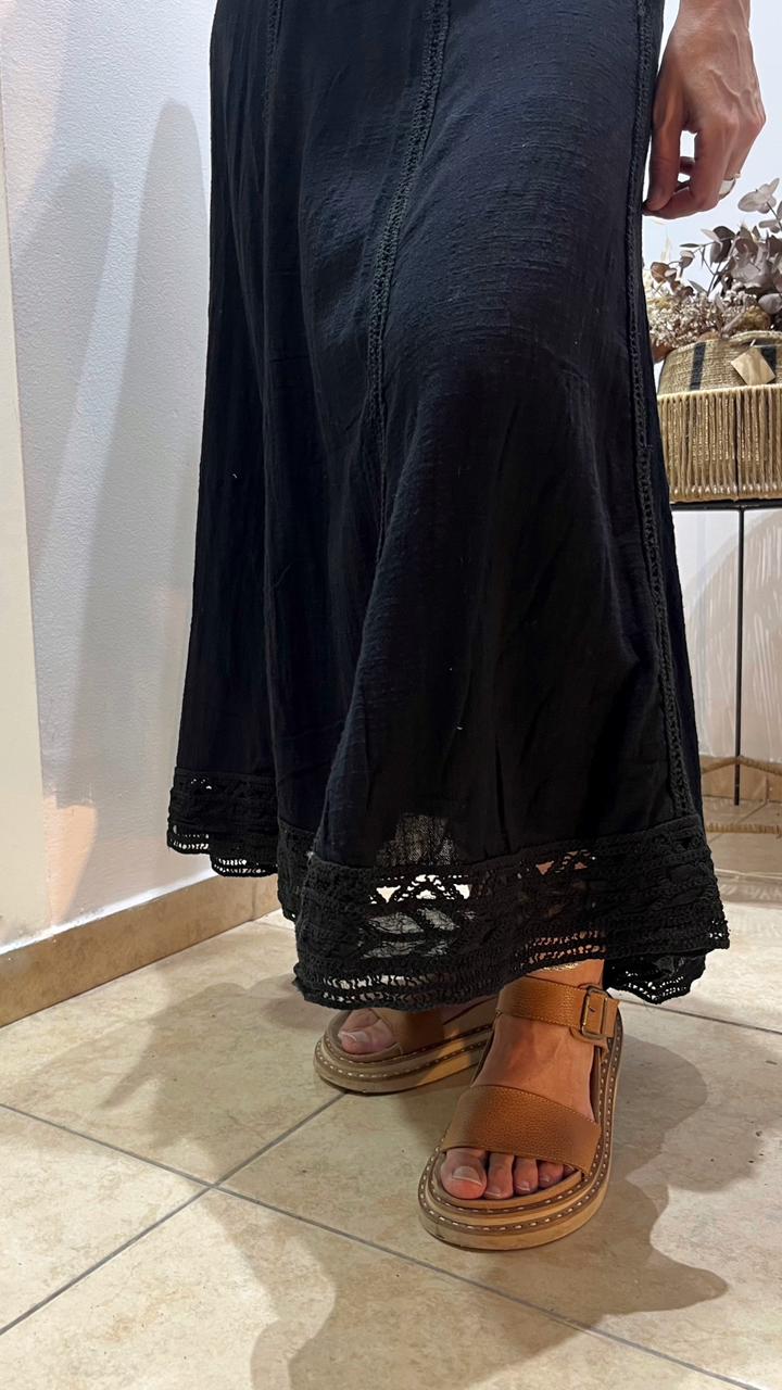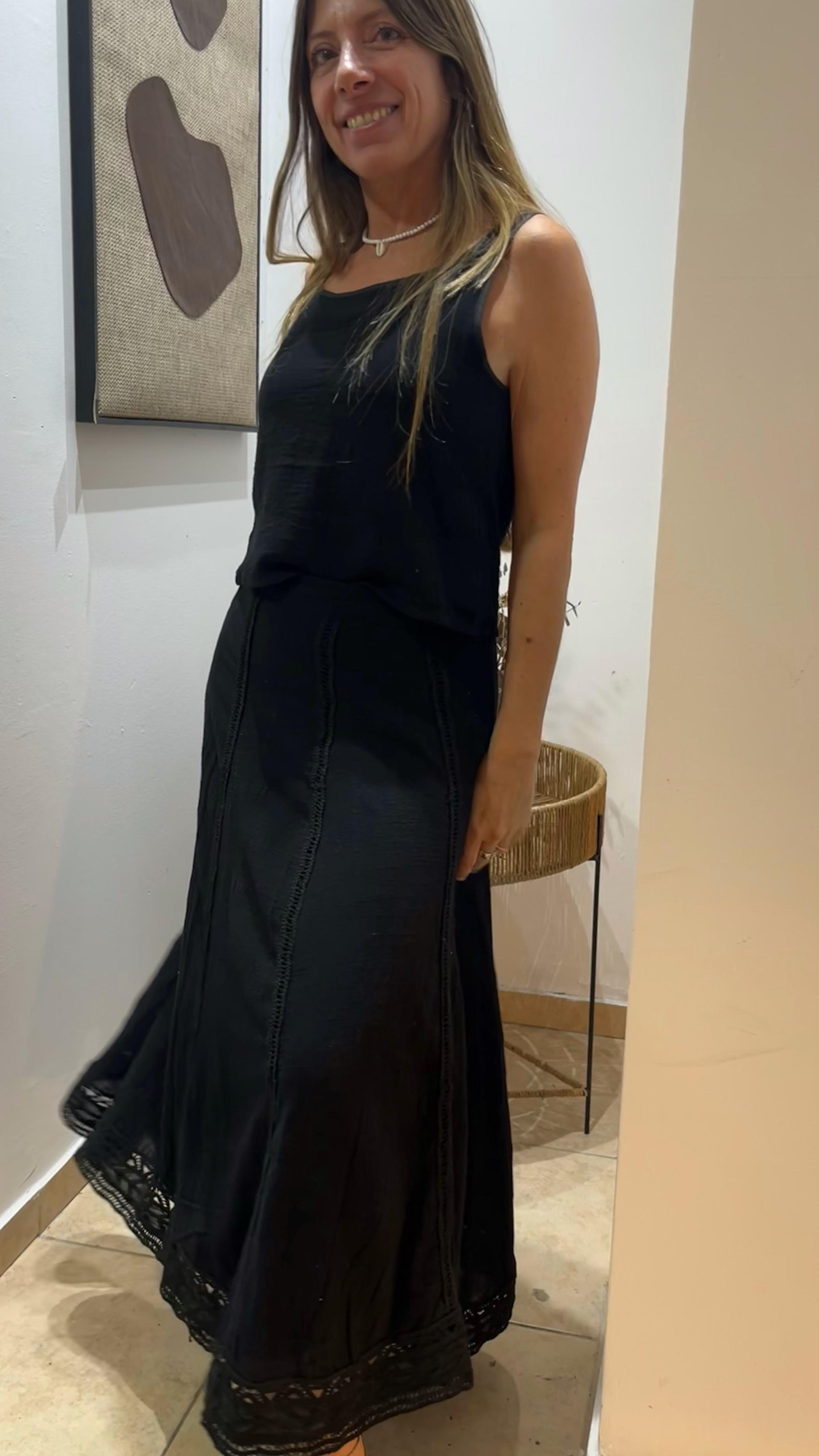 Pollera de lino con enagua negra de seda. Cuatro puntillas de dipiur y en la base. Cierre lateral para un calce y una comodidad perfectos.Talles: M/L