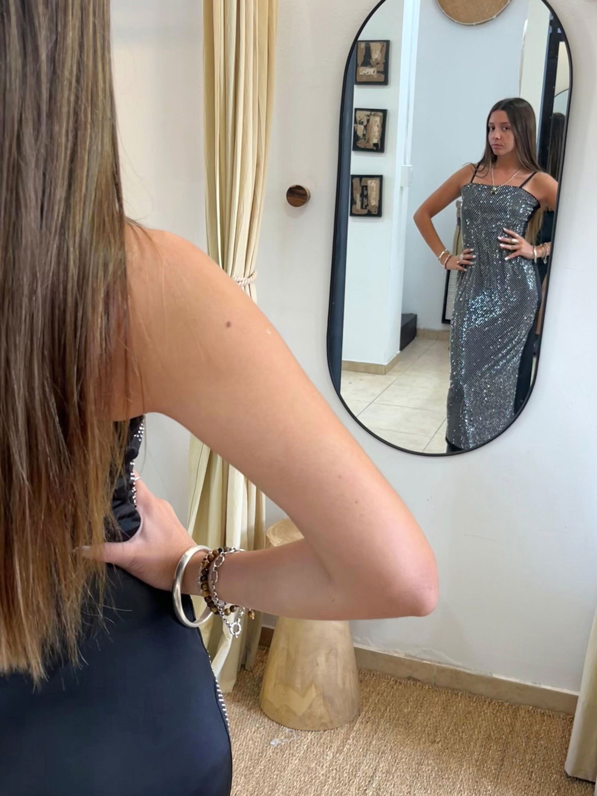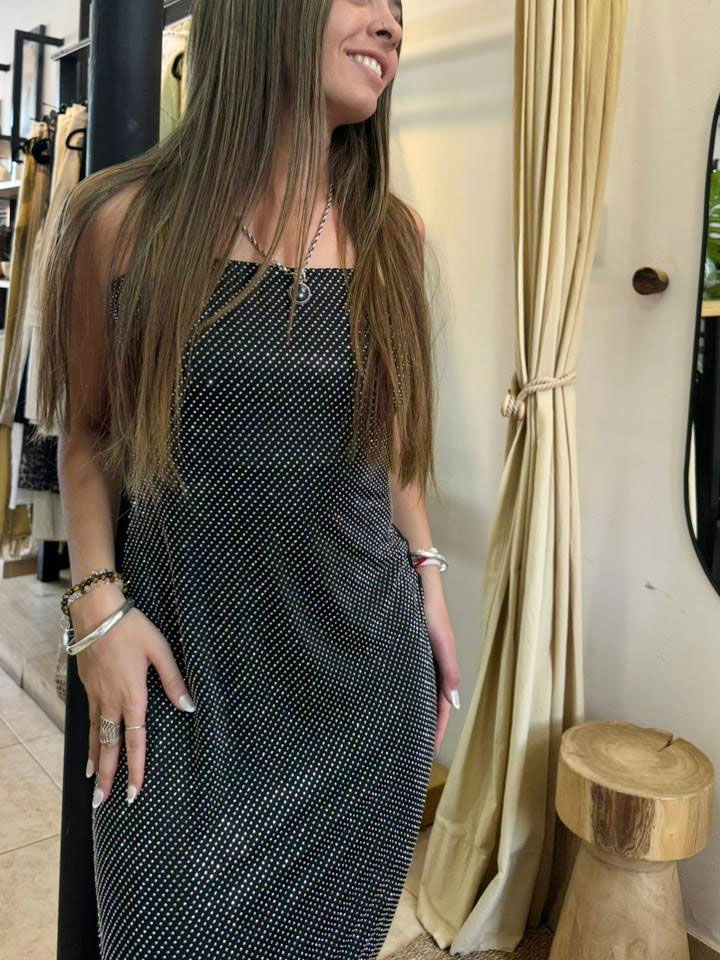 Vestido largo calidad premium, breteles regulables, con caída perfecta. Detalles de hotfix en toda su parte delantera, con tajo en la parte posterior. Ideal para ocasiones en las que pasar desapercibida no es una opción.