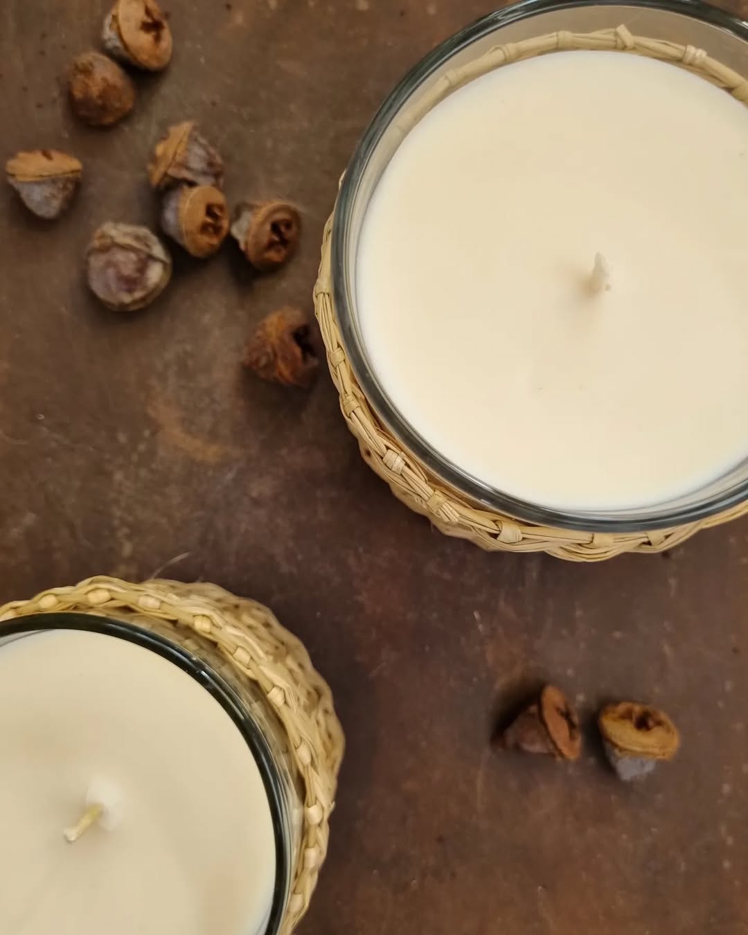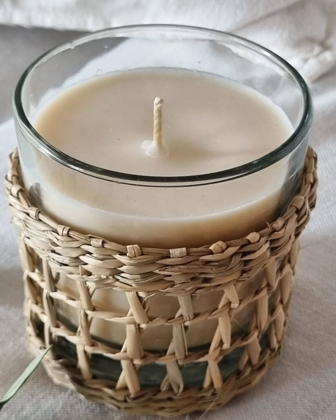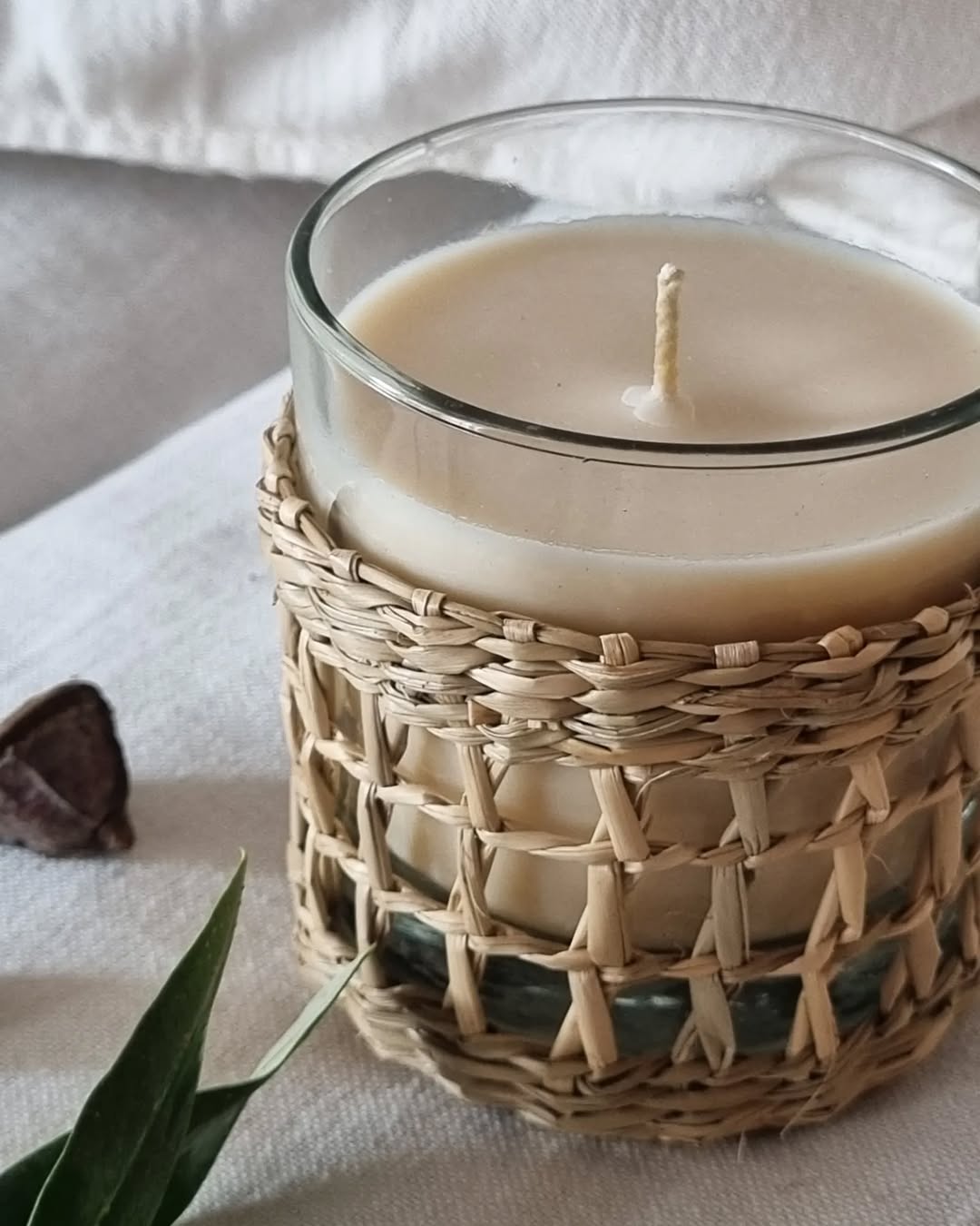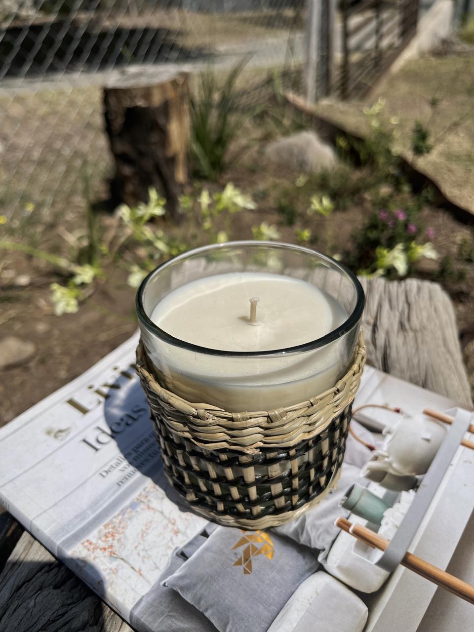 Vela aromatizada en fino envase de vidio con canastita en mimbre. Lucen increíbles sobre todo al prenderlas, ya que proyectan un delicioso juego de luz y sombras.