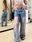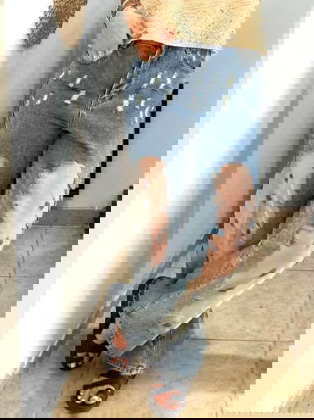 Jean de diseño, recto y cintura alta, con detalles de gasa y roturas.