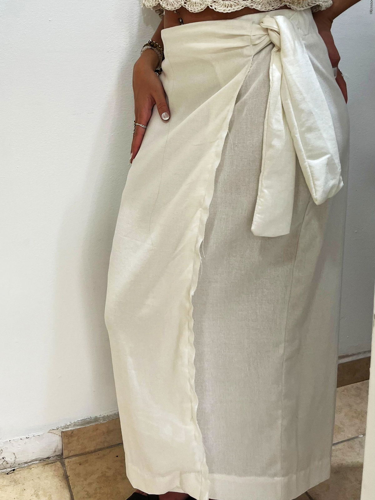 Pollera de lino blanco, con ganchos y atada al costado, con elástico por detrás. Se puede regular.